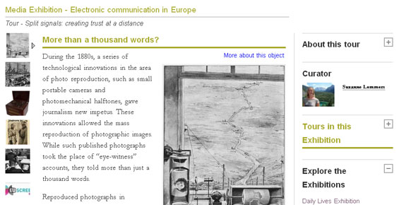 The Inventing Europe website currently offers 6 exhibitions and 34 tours. Each tour is a collection of 4 to 6 stories and outlines an aspect of the history of technology in Europe. The exhibitions group together a few tours around a specific technology theme, such as Daily Lives, Media & Communications, Knowledge Societies, Infrastructure, Globalisation & Governance.